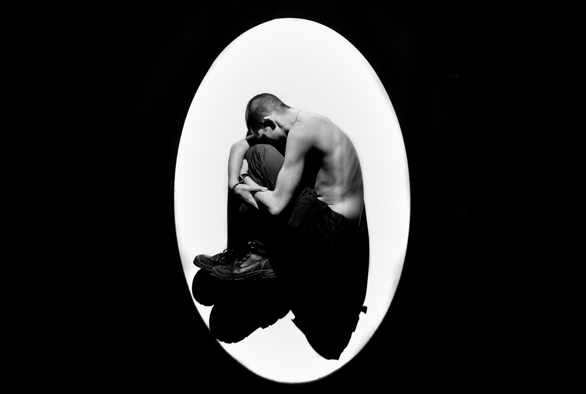 The embryo position surrounded by a light circle spot in complete darkness portrays my own feelings. The circle is the last safe space for the depressed person. Where it feels safe, were it hides from the darkness. A self build shell which helps for a moment but distracts it from the ongoing world.